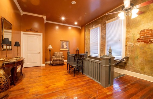 This charming, historic space has over 5,000 square feet with 5 bedrooms, 4 full bathrooms, a fully equipped kitchen, and huge common area with a bar and game room(pool, fooseball, chess tables). We strive to meet all your expectations! *LARGE STAIRWAY TO ENTER* please consider if you have handicap disability that might not allow you to climb stairs.