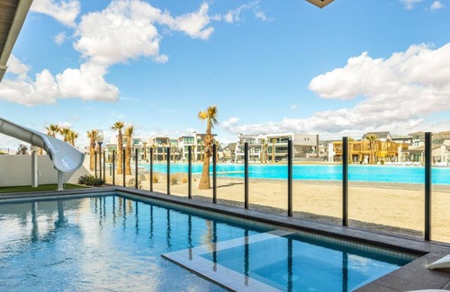 Welcome to The Oasis Utah! This brand new home is nestled directly on the stunning 2.5 acre lagoon in Desert Color and includes: a heated/chilled private pool with 2-story water slide, hot tub, full movie theater, basketball court, cold plunge, workout room, and 3-story kids playhouse. The property also has all the amenities and luxury details you'd expect from Ember Stays – a fully stocked gourmet kitchen, massive dining and gathering spaces, and en suite bedrooms for added privacy and comfort.