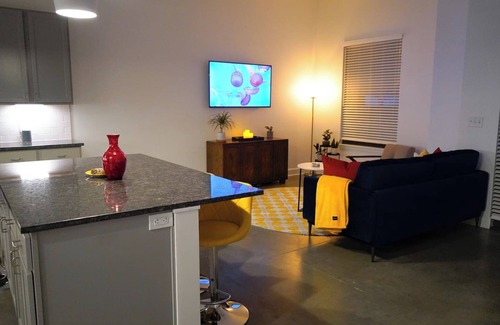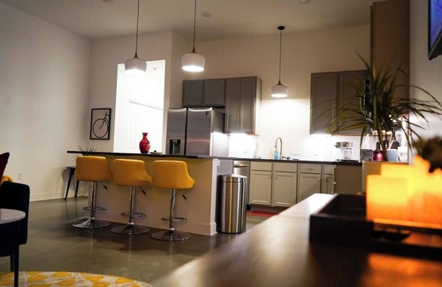 Experience urban living at its finest in this stunning 2BR loft near Massachusetts St. in Lawrence, KS. High ceilings, polished concrete floors, & natural light. Steps from restaurants, shops & nightlife. Don't miss this one-of-a-kind space in the Lawrence Cultural District. Brand new 2 bedroom/2 bathroom loft with 11 ft ceilings and polished concrete floors. This loft is cheerful with a color pallete drawn from local inspiration. Soft designs and low lighting throughout makes this spot warm and inviting. Perfect for a bridal party as Cider Gallery is directly across the street. Guests will have access to the entire loft. This loft in Lawrence, Kansas offers the perfect blend of city living and natural beauty. Located just minutes from the heart of downtown, this address provides easy access to all the best restaurants, shops, and entertainment the city has to offer including Lawrence Beer Company and the Cider Gallery directly across the street. At the same time, it is surrounded by lush greenery and nature, providing a peaceful retreat from the hustle and bustle of the city. The location is also conveniently close to the University of Kansas, making it an ideal spot for students, faculty, and staff. With a variety of housing options available, the loft is the perfect place to stay. This loft offers a variety of options for getting around the city. For those who prefer to drive, there is easy access to major roads and highways, with plenty of street parking available. The city also offers a reliable public bus system which makes it easy to get around Lawrence without a car. For those who prefer to bike or walk, the area is bike-friendly and many destinations are within walking distance. Additionally, many ride-sharing services such as Uber and Lyft are available in Lawrence. With so many options, getting around from the loft is a breeze. All natural shampoo/conditioner and body wash in each bathroom. Large closets provide ample spaces for all of your belongings.