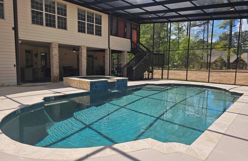 20x40 ft pool, fireplace in living room, queen-size sofa bed, two bedrooms with king beds, bathroom and spacious laundry with direct pool access, pool table in game room and more.