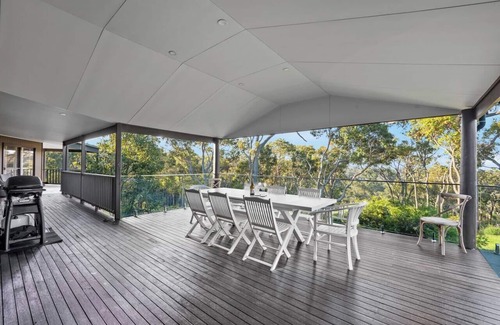 In the left wing, two queen bedrooms overlook the surrounding bushland and open directly onto the verandah. One of these bedrooms features its own ensuite and a large balcony, while the other is served by a nearby family bathroom with a bathtub.