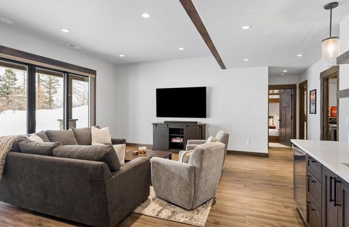 The lower floor of the home is a walk-out basement with a private hot tub on the sprawling patio beneath the second-story deck. This level features a ski locker room with plenty of room for ski gear. It also provides guests with an industrial boot and glove dryer. A mini-master sits just behind the gear room. This bedroom features a king bed, a walk-in closet, a desk & workspace to accommodate our W.F.H guests, and an en-suite bathroom with a shower/tub combination. The third bedroom provides guests with two twin-xl over queen bunk beds, this room can sleep six. A detached full bathroom with a walk-in shower sits just outside the bunkroom. The lower level also offers a second living area. A sectional sofa and two chairs flank the television, and a wet bar lines the inside wall. The outer wall is stacked with windows and sliding glass doors which provide plenty of natural sunlight. The laundry room is also on the lower level.