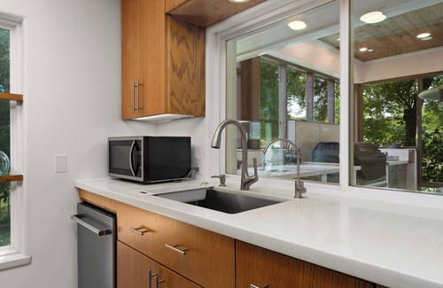 The first full bath is connected to the master bedroom. The half bath is near the entrance/living room. An office nook (desk and chair) is provided if needed. The living room couch converts to a bed which sleeps two. The TV here is a smart TV and WI-FI equipped for streaming! The outdoor patio can be accessed via the living room sliding door. The outdoor patio/sunroom is completely enclosed with screens. It comes equipped with a charcoal/propane bbq pit, outdoor sink, and outdoor dining table.