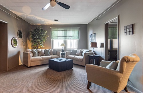 Located on the bricks in historic downtown Fairbury! The Townsend is a full suite with kitchen, onsite free laundry, free Wi-Fi, full bath, spacious living room, and comfy queen size bed in each bedroom. Conveniently located next to several restaurants, movie theatre, boutiques, specialty shops, and coffee shop. Fairbury is surrounded by incredible parks, bike and walking trails, and unique outdoor and historical adventures!