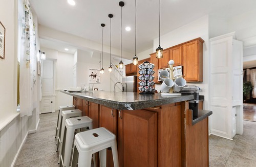 Fully equipped kitchen with stainless steel modern appliances, Keurig machine fully stocked with a variety of coffee pods. Spices, cookware, flatware, pots, pans, cooking utensils and much more! There is a second stairwell in the kitchen that goes to the second floor and a exit out to the back patio cooking area with a gas ready big BBQ for cooking.