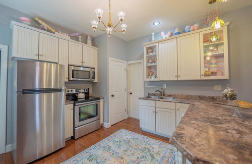 Welcome to The Whimsical Wand, a cozy creekside retreat where every room is filled with enchanting details. Designed for fans of magic and wonder, this home offers a one-of-a-kind stay that blends comfort with a fully immersive themed experience. Relax by the water, unwind in whimsical spaces, and make memories you’ll treasure forever. The home is a cozy creekside getaway that is less than ten minutes from town. However, when you arrive at the Whimsical Wand home, the stresses of life fade and ultimate relaxation sets in. Each room has a specifically tailored theme with amazing attention to detail to keep you immersed in the experience. A very large fenced-in and private back yard has a cozy fire pit with comfy adirondack chairs to relax in while the kids play in the 100 feet of private access creek. The dining hall takes your breath away with the enchanted ceiling, floating candles, and gorgeous chandelier. Have a meal with your friends and family and then select a board game to play together and let the laughs and competition begin. Sit back and put your feet up in the leather recliner or couch and binge watch your favorite movie series while the natural wood fire place keeps you warm in the beautiful sunroom. The kitchen includes a full size oven, full size refrigerator, microwave, pots and pans and everything you would need to cook a 5 course Michelin star meal. Coffee and tea station is stocked and ready. The coffee pot is a Ninja 12-cup brewer and non-stained filters and locally roasted Vienna coffee is included. A French press is also included. An electric tea kettle is included. The master bedroom has a super comfy queen bed, a 37in smart TV, and a dedicated desk work station. The second bedroom has a queen with twin-xl bunk bed. This means that the twin is the same length as the queen to accommodate an adult comfortably in needed. The bathroom is updated with modern touches and a walk in shower. High speed fiber internet