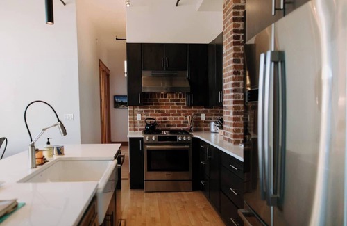 The unit is in the historic Montgomery Ward building which was rehabilitated and divided into condos in 2016. The first floor is commercial spaces - a shoe store is right below the unit.