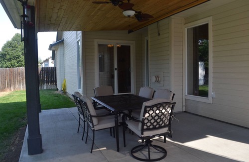 Recently upgraded home in Columbia Village neighborhood of Boise with three bedrooms, den, and two baths. Walking distance to Simplot Sports Park and easy access to Micron campus, downtown, Boise State University, and Lucky Peak Recreation area. Primary bedroom has a king bed and walk-in closet, the other two bedrooms have a queen bed and two twins. Open floor plan with breakfast counter and dining table. Comfortable, spacious living room includes a gas fireplace. Large fenced back yard with a dining table and barbeque on covered patio. Enclosed garage on a quiet cul de sac. Very comfortable home for a family or small group to enjoy Boise and Southwest Idaho.