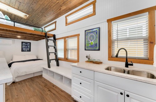 Thoughtfully designed, this cozy tiny house features one LOFTED and one grounded queen size bed, a bathroom with a stall shower, providing a rejuvenating retreat after a day of outdoor adventures. The space-efficient kitchenette includes a sink, coffee maker, microwave, and mini refrigerator, ensuring all the essentials for a delightful stay. Gather around the bar-top seating area for cozy meals and conversations.