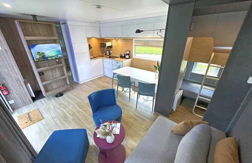 Ground floor: (open kitchen(electric kettle, toaster, cooker, hood, coffee machine(filter), oven(mini), microwave, dishwasher, fridge(+ freezer)), Living/diningroom(TV(flatscreen, satellite, smart TV), dining table(6 persons)), bedroom(bunk bed(duvet)), Bedroom with bathroom(double bed(two single duvets, 160 x 200 cm), washbasin, shower(unit), toilet), Bedroom with bathroom(single bed(duvet, 80 x 190 cm), single bed(duvet, 80 x 190 cm), washbasin, shower(unit), toilet))