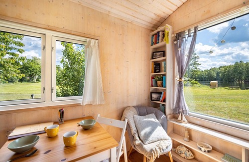This tiny house by the lake is the perfect retreat. The fantastic view of the water, surrounded by green nature, creates a relaxed atmosphere. On sunny days, you can enjoy the view, while the cozy book corner with sofa invites you to linger on cooler summer evenings. A comfortable double bed, a fully equipped kitchen and an eco-friendly dry toilet provide you with everything you need for a relaxing break.