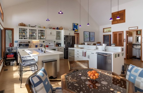 In the same wide open space, you’ll find the kitchen and dining area, allowing everyone to spread out while still enjoying time together. There are multiple options for places to dine – with four seats at the eat-in kitchen table, four stools at one of two kitchen islands, a formal dining table for six, and an additional table for two.