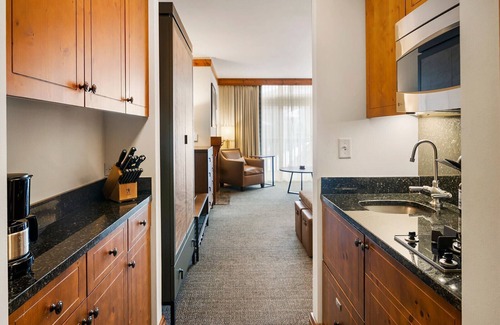- Kitchenette with two-burner stovetop, toaster, coffee maker, hotel-sized fridge, microwave, cookware, and dishwasher