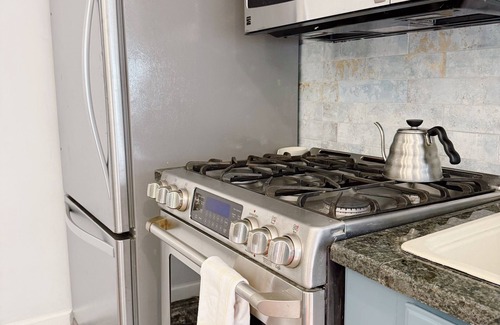 Full kitchen stocked with cooking essentials Washer & dryer for convenience