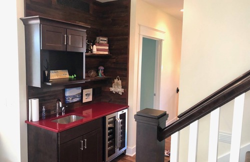 Tranquility is a Lake Michigan view home built with relaxation in mind. This upscale home is furnished comfortably to make a stay feel personal. With 3 stories, everyone can have their own space while being close to the beach and backyard area. The first floor which is street level, has one king-sized bedroom with an ensuite bath and shower. There are three bedrooms on the second floor; two queen-sized bedrooms with ensuite bathroom and a third bedroom with bunk beds with a trundle. This room has a private bathroom with shower. Guests have access to a screened porch seating area or the front porch just to sit and listen to the water or the birds early morning. The third floor is the gathering area with a full kitchen, laundry room and master bedroom with an ensuite completely tiled shower with river rock floor, a tiled seat and rainfall showerhead. The shower is also equipped with 4 jets to hit every spot. The tub is deep and large enough for someone over 6’4”. This floor also has a screened porch with sitting area and table and chairs for dining.