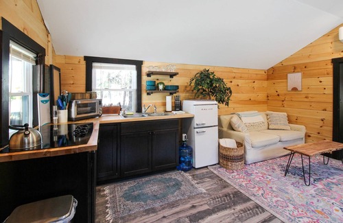 Enter the cabin, kick off your hiking boots, and grab a fresh glass of spring water! A filled jug sits ready for every guest. The kitchen is perfectly appointed with an electric stove top, a toaster oven, a microwave oven, fridge with freezer and a Keurig coffee maker.