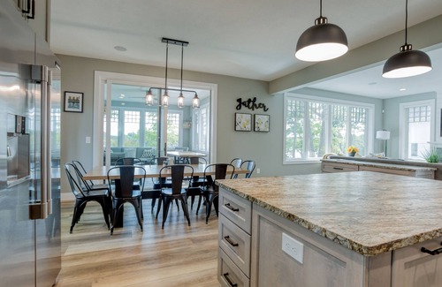 The color gray may not seem like an appropriate color to lift your spirits for a lakeside vacation, but don't worry, we pair gray with yellow fabric and artwork to make this house bright and cheery. The clean lines and mildly modern selections, similar to that of Lakemore Green, in addition to a private hot tub (open all year) and central location, will no doubt make this a fan favorite. Featuring an ADA-compliant main level bedroom, bathroom, and kitchen, Lakemore is proud to offer options for our guests in wheelchairs. All Lakemore Resort homes feature an open concept Kitchen, Dining, 4 seasons screened porch, and main level living room. Views from Arbutus Lake are featured in all the main living areas, and new leather furniture will provide the perfect seat to take it all in.
