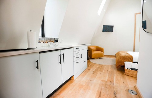 Welcome to our spacious A-Frame Treehouses, where you'll find all the comforts of home. With high ceilings and plenty of natural light, our treehouse is the perfect blend of rustic charm and modern convenience. The open-concept interior features a cozy king-size bed, as well as a pull-out twin bed.