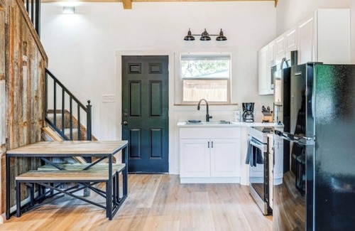 Escape to a new cozy cabin built in 2024 in Mead OK (just outside Durant OK) and unwind in this 2-bedroom retreat with 2 comfortable queen beds. Relax in the pleasant surrounds with a tall vaulted natural wood ceiling, touch of reclaimed wood design, and rocking chairs on serene front porch. Enjoy the convenience of amenities like a full kitchen with ice maker, BQ grill, big screen smart TV, WiFi, hair dryer, and washer/dryer/ironing board during your stay. Relax in the pleasant surroundings and take in the peaceful atmosphere. We look forward to hosting you at our place.