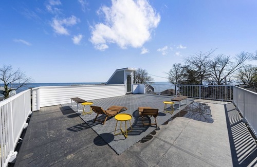 Architect-designed 2022 gut renovation converting three living units into one large family-sized 6-bedroom, 3.5-bathroom pet-friendly house with a spectacular roof terrace that provides panoramic views of Lake Erie. The house is only 15 minutes from Cedar Point and 10 minutes from the Cedar Points Sports Center. Lakeview House also has user privileges at two local beaches, one at Rye Beach Park, a 1-minute walk to the west, and the other at Willow Glen Beach, a five-minute wall to the east.