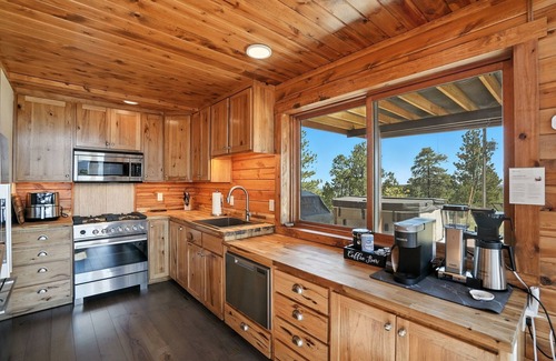 Inside, the lodge boasts an open-concept floor plan with expansive views from every window. Luxury touches include upscale lighting, Moccamaster coffee makers, and premium bedding and linens. Modern amenities like mini-split air-conditioning units, dimmable lighting, and motorized blinds ensure both comfort and convenience. The well-equipped kitchen features stainless steel appliances, ambient floor and under-counter lighting, and a large sliding window that opens to serve the patio and hot tub area. The loft adds to the charm with a mini-fridge, sink, coffee bar, and sleeper sofa.