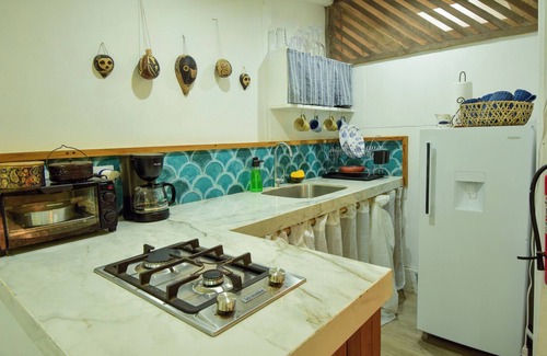 Each kitchen is fully stocked with everything you need to cook delicious meals, including a refrigerator, coffee maker, blender, toaster, utensils, and pantry basics like salt, pepper, sugar, flour, and olive oil. The main house includes a full oven and four-burner stove, while MINI UP! has a two-burner stove and toaster oven.