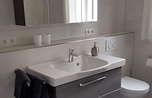 Fast Internet via WLAN and LAN if required. Smart TV with internet and keyboard. Kitchen extractor to the outside. You will also stay in a low-energy house with adjustable underfloor heating. And you always have good air through decentralized ventilation with heat recovery.