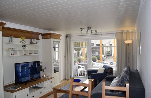 The apartment has a size of 62 square meters and is ideal for up to 4 people and a child (up to 6 years). You enter the spacious hall, which is equipped with a shoe cabinet, a wardrobe and a mirror with shelf. From the hallway, it goes into the individual living rooms. The separate kitchen is very well equipped with a fridge, a freezer, a ceramic hob with oven, a microwave, a coffee pad machine and a dining area with plenty of seating. The bright, friendly bathroom has a shower / toilet, sink, a stool, a mirror cabinet, a hair dryer and a large mirror with mirror. The bedroom is furnished with a large double bed (2.00 cm x 2.00 cm) and a small flat screen TV. The living room has 2 sofa beds (1.50 cm x 2.00 cm and 1.30 cm x 2.00 cm). There's also a flat-screen TV and a cozy sitting area, a coffee table and a dining area. From here you can directly access the covered terrace. Make yourself comfortable and enjoy a sunny breakfast overlooking the courtyard and a glass of wine in the evening. For your brought bicycles, a lockable storage room is available. Also for a parking space is taken care of: this is not right in front of the house, but in the same street and reserved for you. Also on the small is thought, so we provide you on request, a travel cot (fully equipped), a high chair, a buggy (rain cover, beach umbrella, footmuff) and sand toys available. Washer and dryer are available for a fee as well as an ironing board and iron. We also welcome a dog (up to 15 kg).