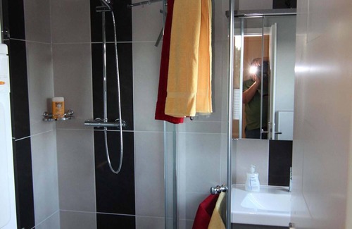 The bathroom is equipped with a full-glass shower, sink and toilet, as well as a washing machine and dryer. Bed linen, tea towels and hand towels, as well as internet use and final cleaning are included in the rental price. You will find a 70-inch television in the living room and a television is also available in the bedroom. There is also a BlueRay player and a variety of films.