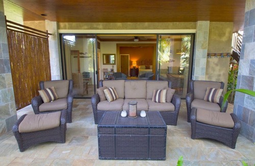 The Pool Terrace Suite bedroom is situated on the ground floor and has it's own separate entrance. It is elegantly appointed, walk in closet, full bath indoor and an out door lava shower. It has a queen Simmons pillow top puna'e bed in the den and King pillow top in the bed room separated by 8 foot mahogany pocket doors. Floor to ceiling glass sliders open up to a 250 sq ft fully furnished private patio gardens and the properties private pool. This suite is perfect for the family of four or close friends who would share the one bath.