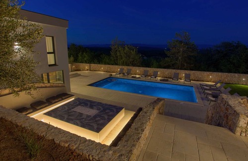 Beautiful luxury villa in Vrh on the island of Krk for 12 persons. The villa has 6 bedrooms and seven bathrooms - three ensuite bedrooms with double beds and three ensuite bedrooms with two single beds that can be combined into double beds if necessary. Guests have at their disposal an outdoor heated pool (50m2), an indoor heated pool, a jacuzzi and a sauna. Under the stone gazebo there is a summer kitchen with a grill and a dining room. In the basement of the house there is a room with exercise equipment. Guests also have a table tennis at their disposal. The entire villa is air-conditioned. The villa also has underfloor heating and cooling. Private chef and massage services available at an additional cost.