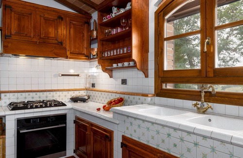 The villa is surrounded by about 300 square meters of fenced garden on a 1.5 hectare property cultivated with olive groves, fruit trees and vegetable garden. Access from the road leads to a gravel driveway and a parking area on a lower level, with pedestrian access through a gate and two flights of stone stairs: one leads to the main entrance, the other to the outdoor terrace. The lawn garden adjacent to the villa is bordered by bay hedges and includes cypresses, olive trees, terracotta pots with flowers and a wrought-iron gazebo covered with vines. A stone fountain is located among the rose bushes, while the side area is shaded by tall pine trees. N.B.: Please note that the photo shoots are usually carried out in spring, so the colors and blooms of the gardens, lawns and parks may be different when you enter the villa.