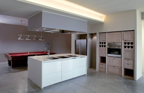 You will be able to enter the kitchen from the living room through a stone arched opening. It is equipped with a five-burner induction cooker, an electric oven, a refrigerator with freezer, a dishwasher, an Italian-style coffee-maker and a kettle. The dining table can accommodate ten guests. From the kitchen three French doors will take you to the second patio and the garden. The room also has three glass walls, as well as three small windows, and is equipped with an air conditioning/heating unit.