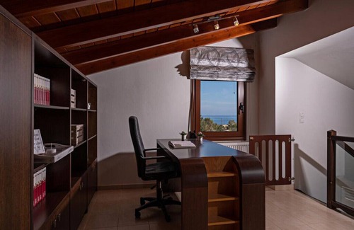 Inside, on the first level of the house you will find the fully equipped kitchen, with oven, hobs, dishwasher, cooking utensils, etc which gives you the opportunity to prepare your meals with comfort and safety and enjoy them. hanging out with your loved ones. The living room of the house with plenty of natural light, comfortable sofas, satellite TV and elegant and neat decoration aims to contribute to the relaxation and tranquility you need on your vacation. The dining area in the same area is waiting for you and your family or friends to enjoy your meals. The balconies of the house are equipped with outdoor furniture, have a wonderful view of the sea or the pool of the house and invite you to enjoy enchanting sunsets.