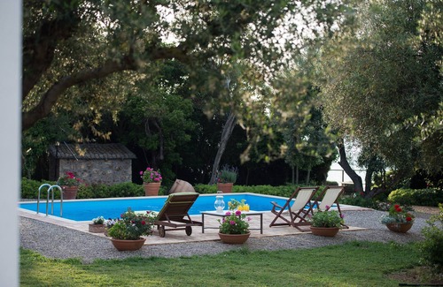Villa Feia in Korakohori is situated in a private olive grove. It's overlooking a bay with access to the sea and has views of the Ionian sea, with clear day and night views of Zante and Kefallonia. The villa has its own entrance (gate) and private garden, and has direct access to the bay. The villa meets the exacting standards of the Greek National Tourist organisation . The short-term lease registration number is 00000179246 . A spacious and architecturally designed house (with a personal and hospitable touch), it can comfortably accommodate up to 5 people. Large veranda and garden, opened terrace, barbecue and terrace shower, garden furniture, dining area with a view of the sea and garden and a private swimming pool are just a few of the amenities on the ground floor.. Both bedrooms on the second floor have comfortable furniture and their own balconies with breathtaking views of the sea and garden. The living room can sleep 1 person on a comfortable sofa bed when needed. The living room also includes a dining area. All outside areas are fully lit at night and both the property and the garden are suitable for children. Its unique location and surroundings makes it a popular destination both for summer and winter travellers.