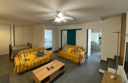 La Kaz Instang Salé / Etang Salé Les Hauts Bottom of villa - 6 people - 2 bedrooms - 55 m² - jacuzzi HOUSING LAYOUT: The living space of approximately 20m² with equipped kitchen open to the living room and giving access to the covered terrace, offers a perfect setting to relax after a day spent discover the region. The jacuzzi benefits from a green setting facing the ocean. The sleeping area consists of 2 bedrooms, each comprising a double bed ; and a bathroom with bathtub and sink, 1 separate toilet. THE OPINION OF BENOIT, your host: First you will appreciate the breathtaking sea view!!! You will enjoy sitting in a friendly outdoor space (kiosk, sofa, dining table, built-in barbecue, swing, bar seats facing the sea) all in a Zen garden. You will enjoy a modern jacuzzi for exceptional moments of relaxation. The pleasure of enjoying the calm of the heights of Etang Salé, 15 minutes from the expressway. Perfect for a relaxing family vacation for up to 6 people (2 double beds + 1 sofa bed). Many activities await you on the island, such as hiking, golf, tennis, cycling, scuba diving, paragliding, swimming and water sports. Don’t hesitate to ask your host for advice. • By plane: Roland Garros airport is 100 km away. INFO/CONTACT: Price: From 150 €/NIGHT End of stay cleaning: €80 Minimum length of stay: 2 nights Adult tourist tax: Included in the price Deposit 1500€ Arrival time: 3:00 [hidden] Departure time: 12:00 [hidden] (Flexible if necessary) Accommodation capacity 6 people maximum (2 double bedrooms plus a convertible sofa in the living room.). Non-contractual photo. To note: Parking space: 2 spaces outside fenced and secure courtyard Accommodation suitable for newborns: yes (travel cot) SHEETS, TOWELS AND CLEANING PACKAGE ARE INCLUDED IN THE PRICE OF THE STAY Additional equipment included: swing, washing machine, table and iron iron, dishwasher, hairdryer, cleaning supplies, coffee machine, kettle, air blowers. Our animal freinds are not admitted. Smoking is permitted outside the premises only. Festive and noisy evenings, not authorized out of respect for the neighborhood. *** Property managed by a professional. Unless stated, services such as cleaning, bed linen, towels etc. are not included in the price of this rental. If pets are allowed (information in the advertisement), charges may be applicable. Only equipment mentioned in this advertisement are present. Equipment not mentioned are not considered to be present.