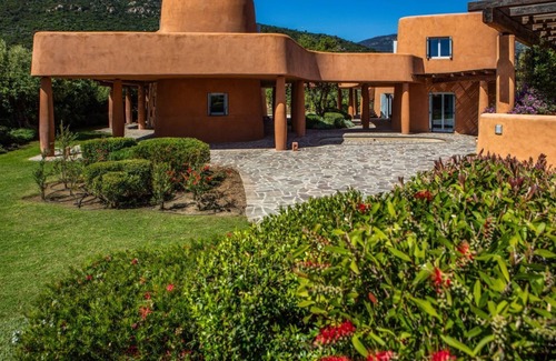 Prestigious design villa with swimming pool, immersed in an area of extremely high environmental value, embraced by a delightful garden with swimming pool and fantastic views, just a few steps from a beautiful golf course and a few minutes from the enchanting beaches of Nora, Santa Margherita and Chia.