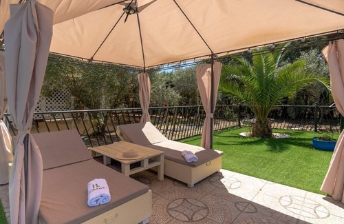 In the villa, you will also find four bedrooms, where up to 13 people can relax and recharge their batteries. One bedroom is equipped with one double bed and an en-suite with a shower; two bedrooms are furnished with a double bed each. In the fourth bedroom, you will have a double bed, above which, a bunk bed is located; another bunk bed completes the layout of the room. A sofa bed for two people is located in the living room, and an extra bed can be placed in the hall leading to the bedrooms, thus this house sleeping 13. Another bathroom with a shower is available inside the house.