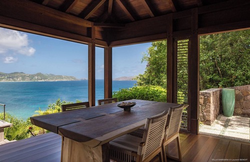 Located in Pointe-Milou, the charming rental villa SAMSARA offers a panoramic view over the glorious sunsets on the ocean. In an exotic decor, this two beautiful air-conditioned bedroom home is the ideal place for a family or two couples traveling together in St. Barts.