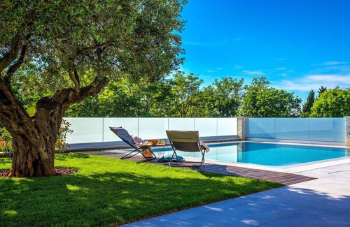The stunning Villa Vista Savudrija is without a doubt an excellent choice for a relaxing vacation with family and friends. This spacious and modern designed villa can accommodate a total of 8 guests on 2 floors and 4 bedrooms. The outdoor area will certainly fulfill all your vacation expectations. A 33 m² private pool with hydromassage will not only keep the kids busy for long hours, but will also provide you with much needed refreshment on hot Mediterranean summer days. Relax poolside on the sun loungers, read your favorite book or simply enjoy a refreshing drink. The outdoor area also has an amazing old olive tree under whose natural shade you can completely let go of everyday stress. A beautiful covered lounge area is also perfect for enjoying your morning coffee, for example. From here you enter the spacious indoor living area, which consists of a living room, a dining area and a fully equipped kitchen. This space is fully air-conditioned, filled with natural light thanks to the gallery windows and modernly designed with wooden and blue details. On this floor, guests will find a bedroom with a double bed and a bathroom with a shower. On the second floor there are 3 more bedrooms, 2 with 2 single beds and 1 with a double bed, as well as 2 bathrooms, each with a shower. So if you want to explore Istria and stay in a beautiful and modern villa, Vista Savudrija might just be for you. Start planning your Croatian adventure today and find out why guests love it here! Villa Vista Savudrija is located in the heart of Savudrija, in the northwesternmost part of the Istrian coast. The area is known for windsurfing and golf. The villa is close to beaches, bars and restaurants. Savudrija, once a fishing village, is only a short drive from the coastal town of Umag. Umag offers a wide range of leisure activities and tourist amenities, as well as a small harbor. Excellent restaurants, bars and cafés can be found in its pretty cobbled streets. Every July the ATP Croatia Open is held here, featuring many of the biggest names from the men's tennis world. The magical countryside of central Istria, famous for its enchanting medieval hilltop towns and gastronomic delights, is easily accessible along excellent roads.