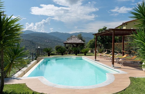 Villa Vittorio is located in the hills that separate Dolcedo and Imperia, and is framed by a panoramic terrace that connects it to the lush garden with swimming pool. Designed to fully enjoy the outdoor spaces, the property includes two outdoor dining areas, one of which has an outdoor kitchen with wood oven and barbecue, as well as botanical trails framed by olive trees and amphorae. The villa can accommodate up to eight people and has a living area, three bedrooms and two bathrooms. The modern and functional interiors open onto a large terrace accessible from every room. The beaches, villages and markets of the Riviera dei Fiori are all just a few minutes' drive away. Note: the owner lives in the basement in a private way, with a separate entrance and no common area.