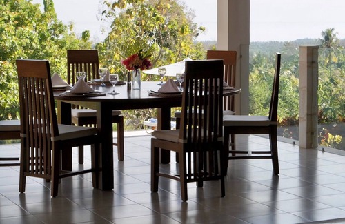 The dining terrace can seat up to 10 people, where you can enjoy dinner & drinks surrounding by the spectacular scenery. There is a large hand carved Balinese daybed in the kitchen dining space.