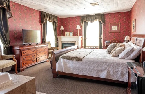 The beautiful furnishings and a cozy fireplace beckon you to unwind. The in-room jacuzzi and Main Street view of the charming Geneseo Main Street are the cherries on top of a perfect room for your stay away from home.