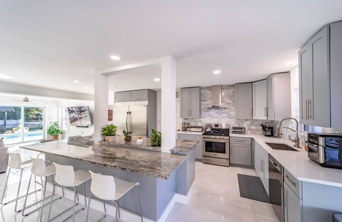 This beautiful 3 bedroom 2 bathroom Waterfront jacuzzi heated pool home in Bel Air Lauderdale by the Sea- Walk to the Beach! Tastefully redone come and relax by the water-Walk to dining, shopping, and outdoor happy hours! Relax by the outside fire pit, walk to the beach, bring your boat, we have room for a 27 ft boat! Live the Florida outdoor lifestyle in this amazing home!