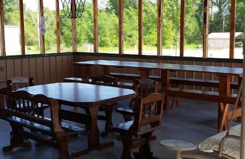 There are 2 twin beds, 2 full beds and 1 queen bed, sleeping up to 8 people, all bed linens are provided. This is a bunkhouse so they are bunkbeds and all in one room with 1 bathroom. There is a sofa, table and chairs, refrigerator, stove, microwave, cabinets, pots and pans, baking pans, plates, bowls, coffee cups, silverware, serving spoons, cooking utensils, mixing bowls, colander, gallon pitcher, electric griddle, toaster, hand mixer, small coffee pot, blender, toaster oven and bath towels are available, if you chose to use ours. We have a charcoal grill available to use also. The kitchen sink and additional tables are in the pavilion just outside the door.