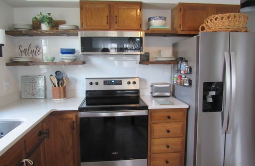 Updated open concept Kitchen, dining Area and Living Room with TV. A roomy 3 seasonal closed-in porch with TV. Convenient first floor bedroom with queen bed. Second Floor offers 2 spacious bedrooms-one with a king and other with 2 full size beds and twin . Bathroom with tub only completes this floor. All bedrooms have ceilings fans and new mini split air condition units for the warm nights. Crisp White bed linens and bath towels are offered as well as beach towels. Kitchen is fully equipped with appliances, cooking essentials, mini split air-conditioning and plenty of seating for family and friends to gather. Full size washer and dryer located in first floor bathroom.