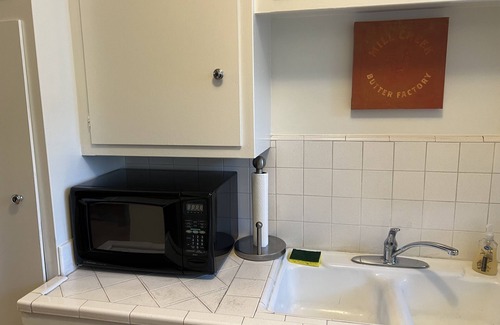 There is a plug in electric stove with two electric stove burners. There is not an oven. There is also a fully functional toaster oven and a microwave and a full size refrigerator. Two TV’s. One TV you can connect to your laptop and project everything on the Samsung TV screen. Second TV you must screen mirror to the TV. There is not any cable. There is a radio system as well!