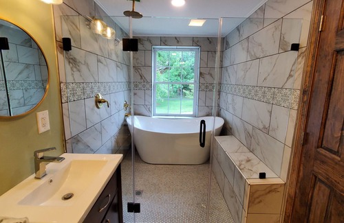 King Bedroom with beautifully renovated bathroom with extra long shower and soaking tub