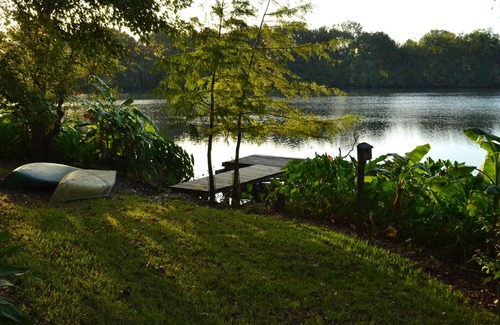This offers a spectacular panorama view of a private 55 acre lake, secluded with privacy. The cottage is under umbrellas of shade with the night jungle sounds of all the creatures hidden. This is a custom-built cabin of a recycle historical materials, uniquely furnished. A shared kitchen with Kathleen is optional as she has her separate quarters. She encourages healthy foods and a great kitchen to perform in.
