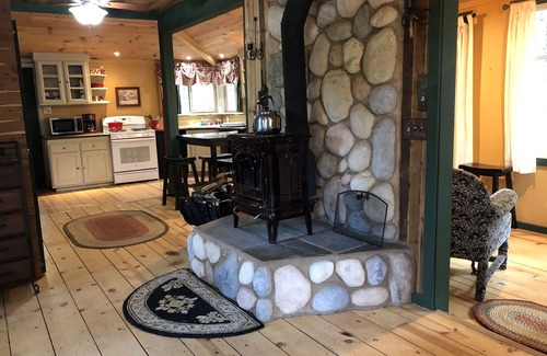 This cabin has a cozy living room with a wood burning stove and a beautiful rock wall and spacious kitchen to cook your meals. Sit and drink your coffee or tea in the sun room, looking out at the mountain side where you will see several different types of birds.